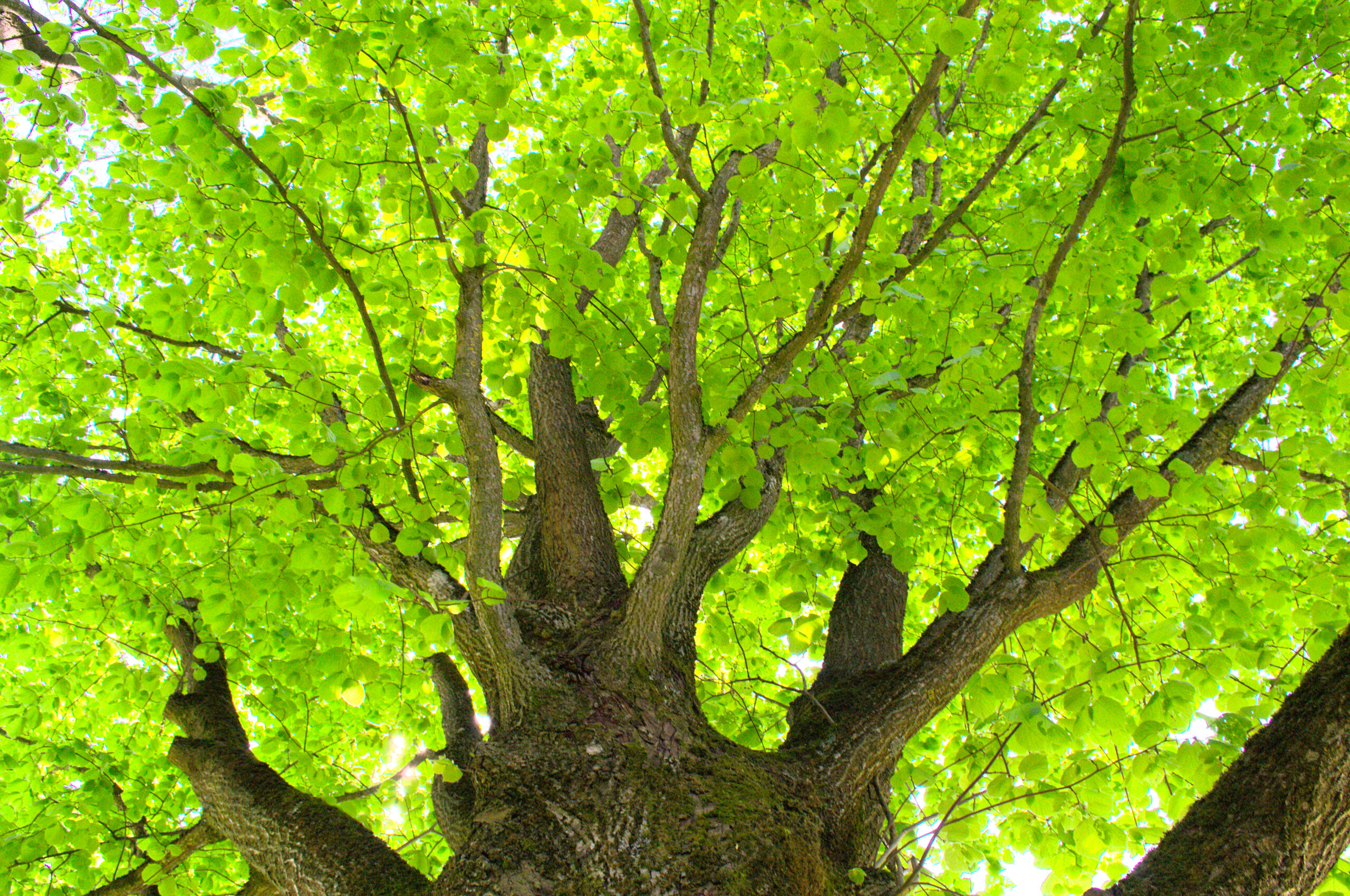 Das Foto zeigt eine Nahaufnahme eines Baumes von unten betrachtet. Der Stamm des Baumes ist im Vordergrund zu sehen und ragt hoch in den Himmel. Die Äste und Zweige sind in einem Netzwerk aus verschiedenen Winkeln miteinander verwoben und bilden eine dichte Struktur. Im Hintergrund ist der Himmel zu sehen, der durch die Blätter des Baumes hindurchschimmert. Die Details der Rinde und der Äste sind gut erkennbar und geben einen Eindruck von der natürlichen Schönheit des Baumes.