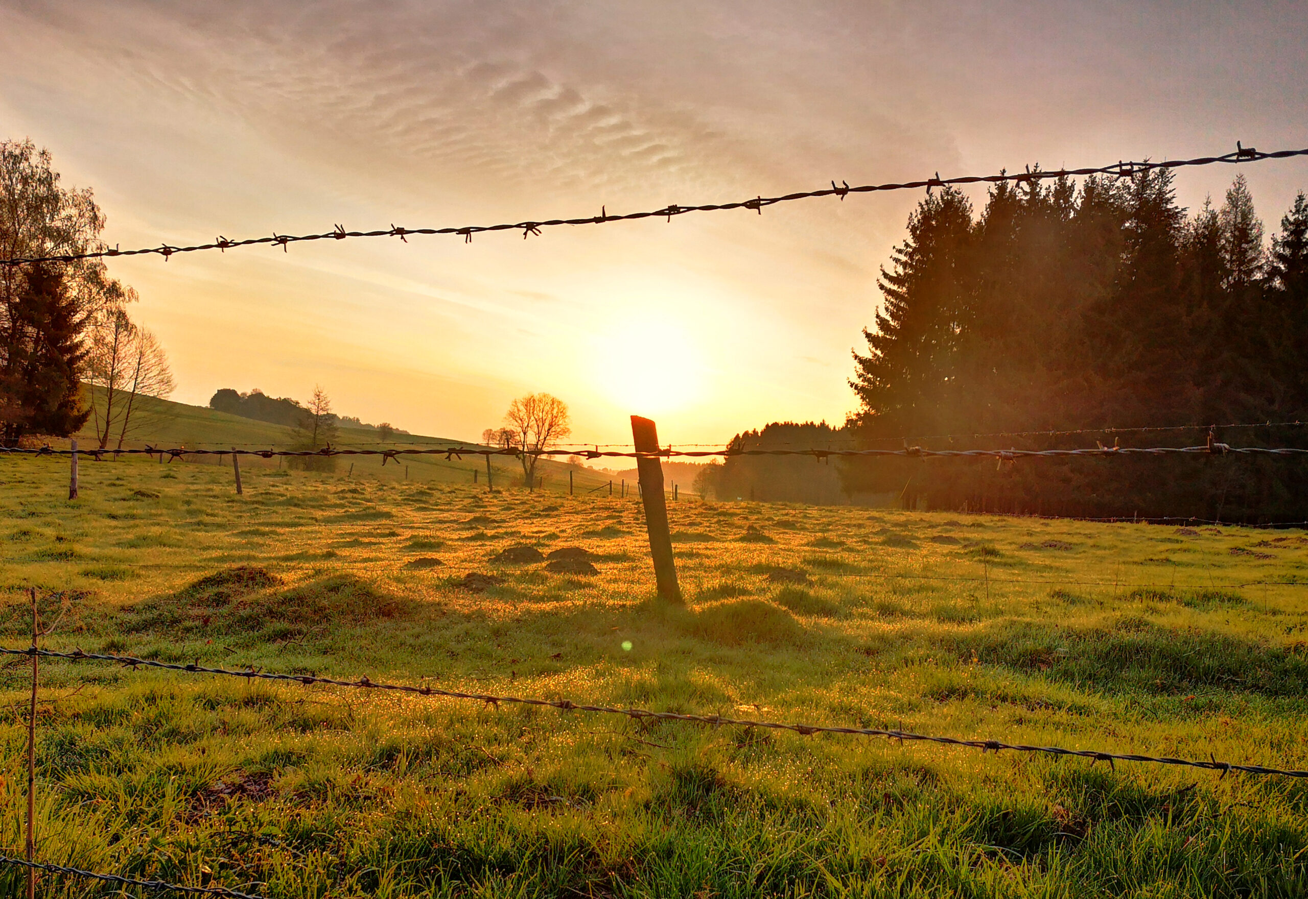 Das Foto zeigt einen wunderschönen Sonnenaufgang, bei dem im Vordergrund eine Weide zu sehen ist. Im Hintergrund erstreckt sich ein Wald und die Sonnenstrahlen tauchen die Landschaft in ein goldenes Licht.