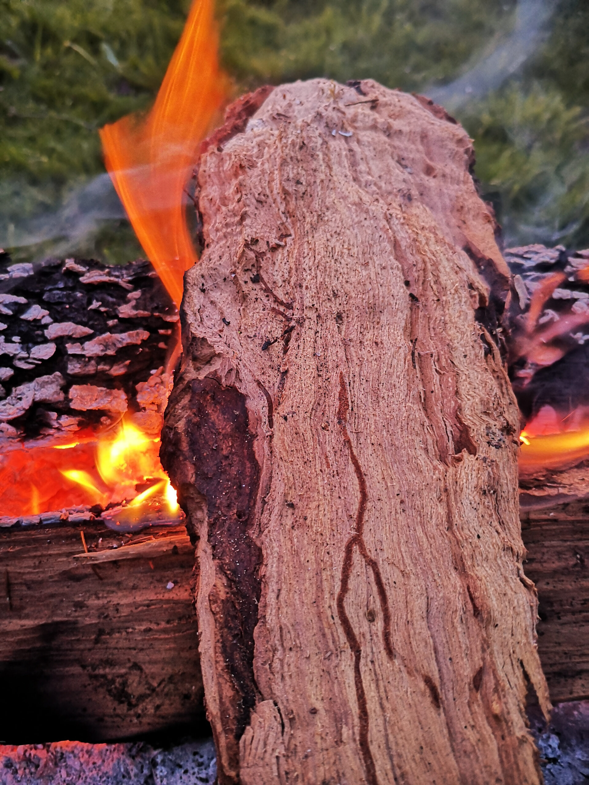 Eine stimmungsvolle Aufnahme eines Lagerfeuers inmitten einer natürlichen Umgebung. Die Flammen züngeln empor und werfen ein warmes Licht auf die umliegende Landschaft. Im Hintergrund erstrecken sich majestätische Bäume und die Silhouette eines Berges zeichnet sich am Horizont ab. Die warme Farbpalette des Bildes vermittelt ein Gefühl von Gemütlichkeit und Entspannung und lädt den Betrachter dazu ein, in die Natur einzutauchen und den Moment zu genießen.