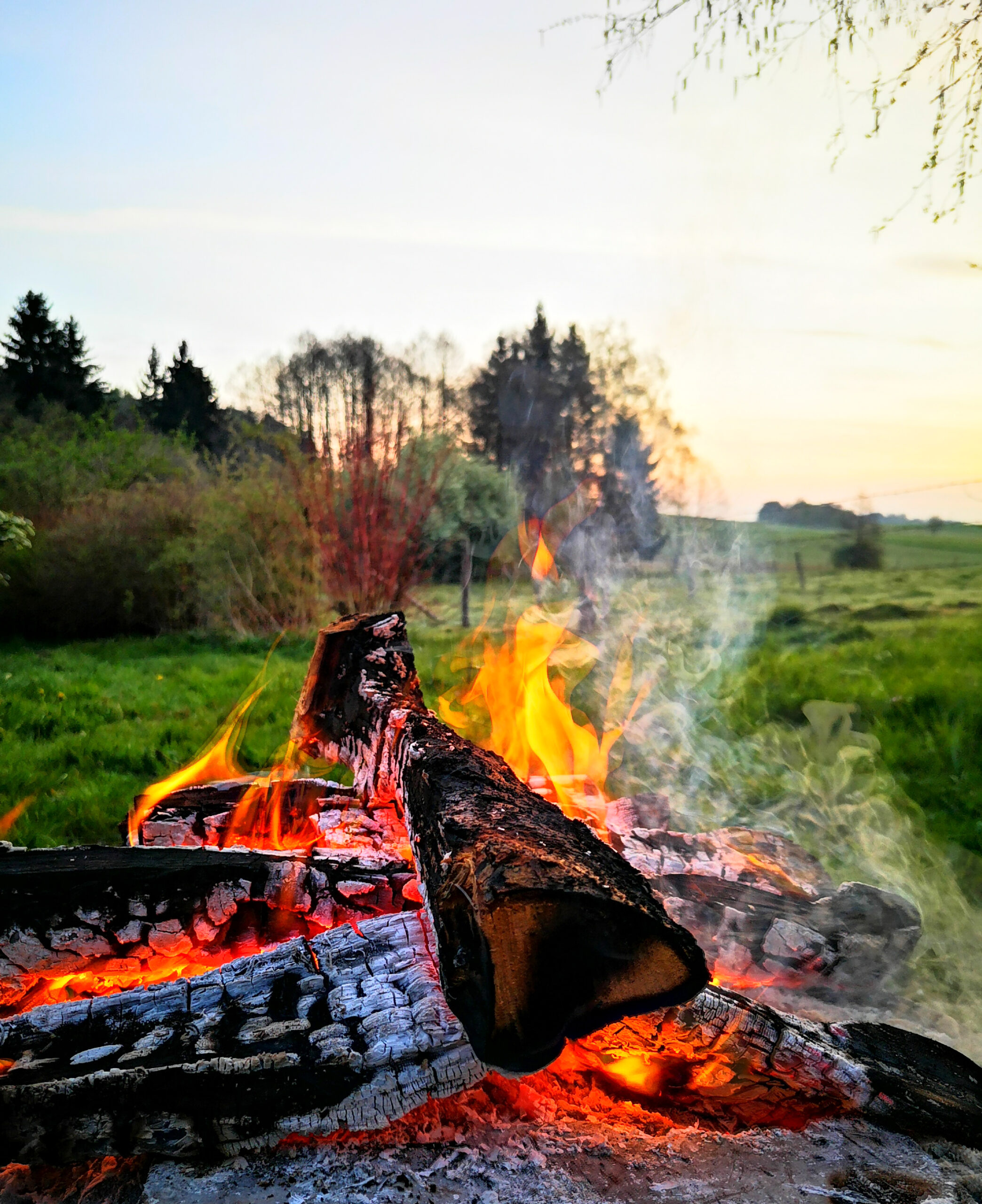 Dieses Foto zeigt ein gemütliches Lagerfeuer inmitten einer wunderschönen Naturlandschaft. Der betrachter kann die Wärme und Geborgenheit spüren, die das Feuer ausstrahlt, während im Hintergrund die Schönheit der Umgebung zu sehen ist, wie z.B. Bäume und Sträucher. Es ist der perfekte Anblick für jeden, der sich nach Ruhe und Entspannung in der Natur sehnt. Es eignet sich hervorragend als Wanddeko in einem Wohnzimmer oder Schlafzimmer, um eine entspannende Atmosphäre zu schaffen.