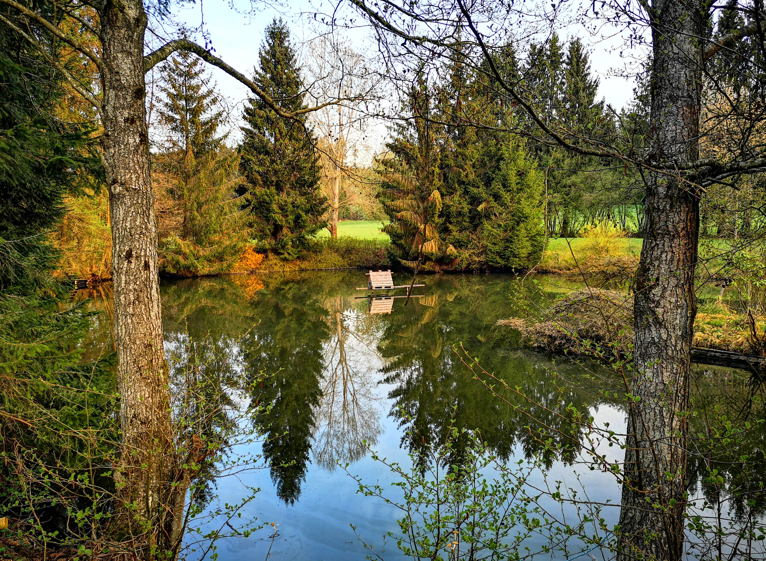 Das Foto präsentiert einen wunderschönen Waldweiher mit glasklarem Wasser. Im Hintergrund sind majestätische Tannen zu sehen, deren Spiegelungen sich auf der Oberfläche des Weihers widerspiegeln. Die gesamte Szenerie strahlt eine beruhigende und friedliche Atmosphäre aus.