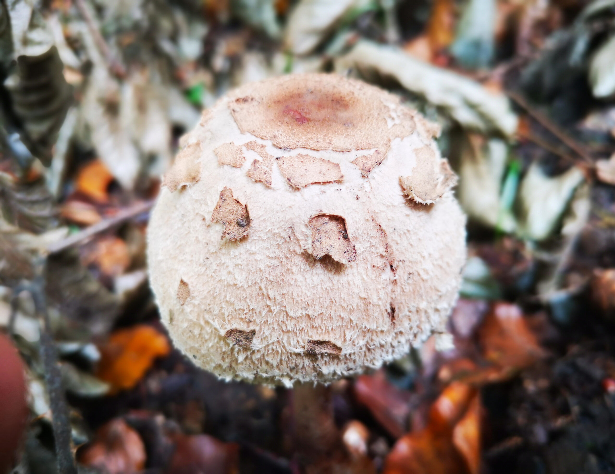 Das Foto zeigt eine Nahaufnahme von Riesen-Schirmlingen, die am Boden des Büdinger Waldes wachsen. Die Pilze haben einen großen, hellen Schirm und einen kurzen, dicken Stiel. Die Schirme haben eine durchschnittliche Größe von etwa 20 cm, können aber auch bis zu 40 cm im Durchmesser erreichen. Die Riesen-Schirmlinge sind eine häufige Pilzart in Laubwäldern und werden oft in der Küche als Speisepilze verwendet.